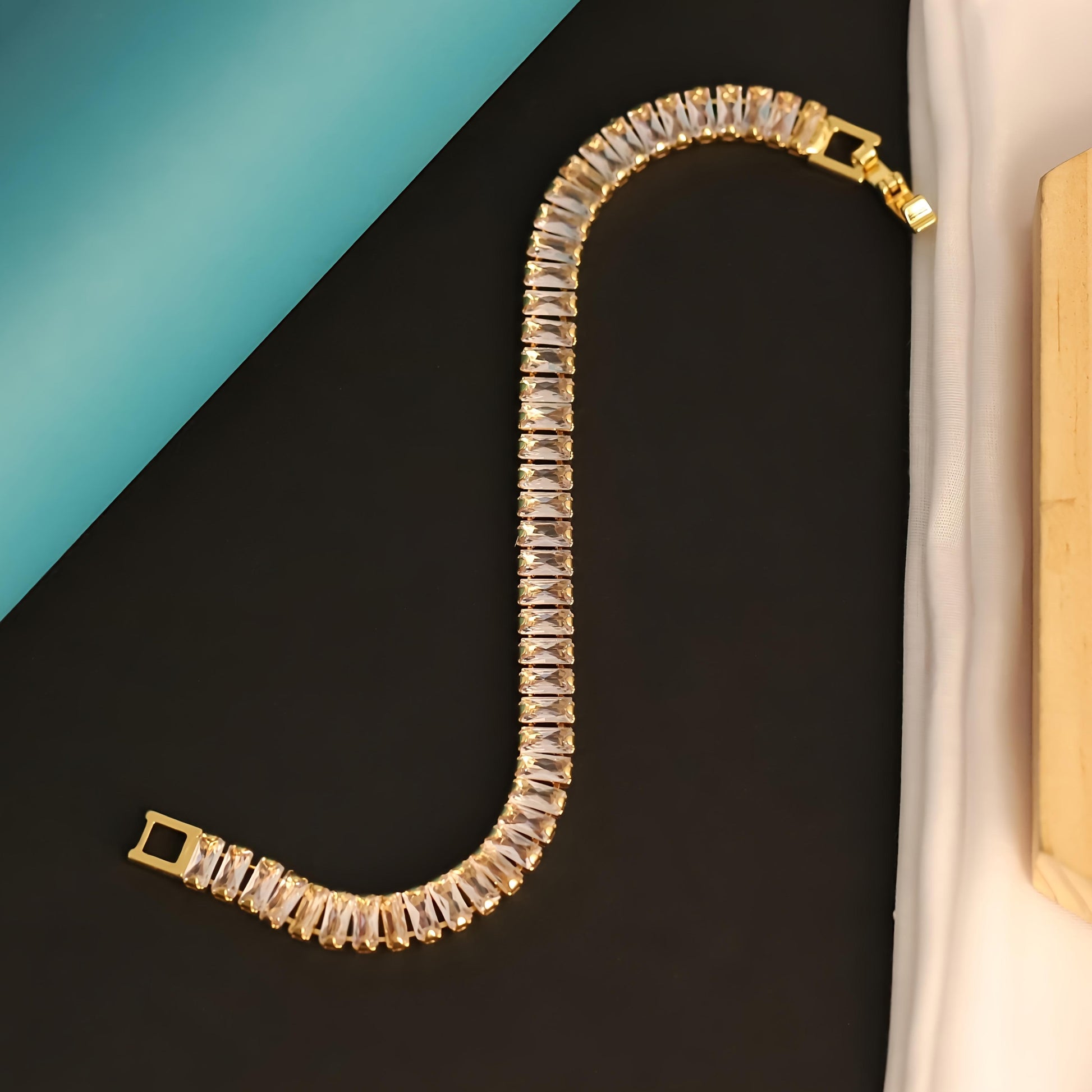 Elevate your everyday look with this elegant anti-tarnish tennis bracelet. Featuring a double row of shimmering baguette-cut stones set in a waterproof, hypoallergenic finish — it's crafted to shine without fading. Whether worn solo or stacked, it’s a timeless piece made for lasting brilliance.