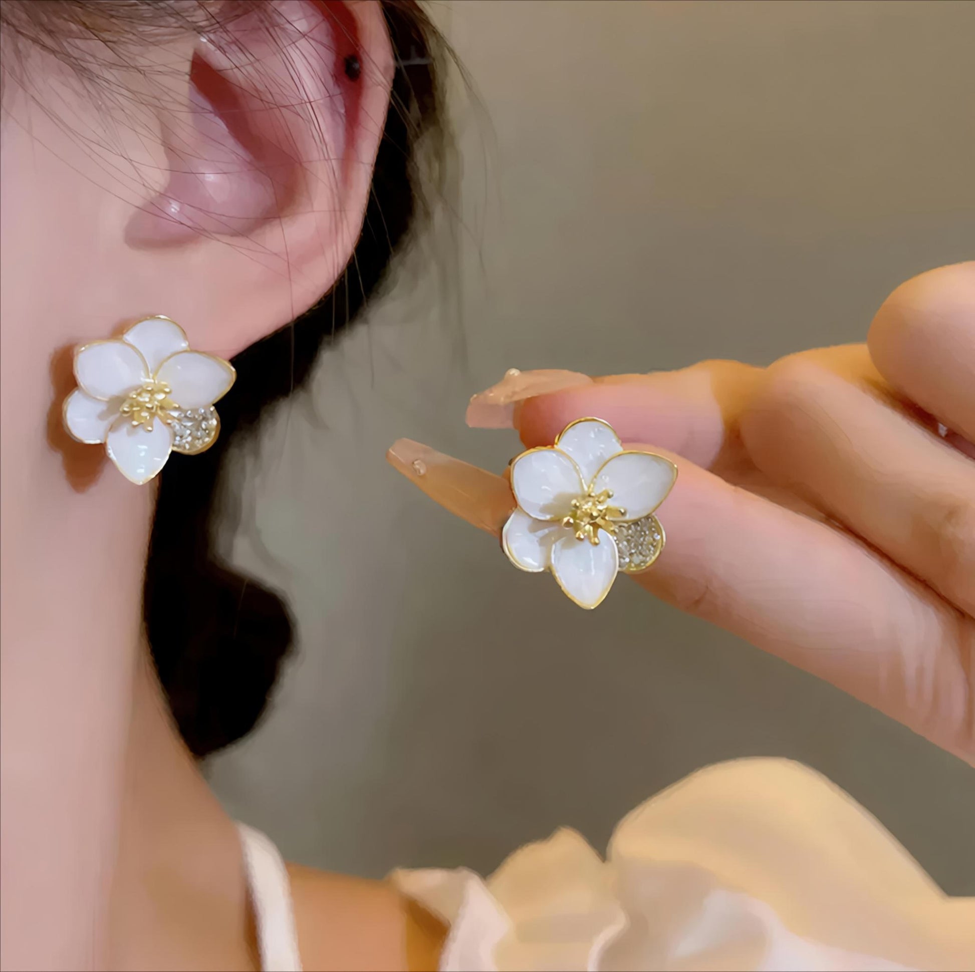 Delicate floral studs crafted with pearlescent petals and sparkling crystal accents. These charming earrings effortlessly blend elegance and femininity, making them perfect for everyday grace or special occasions.