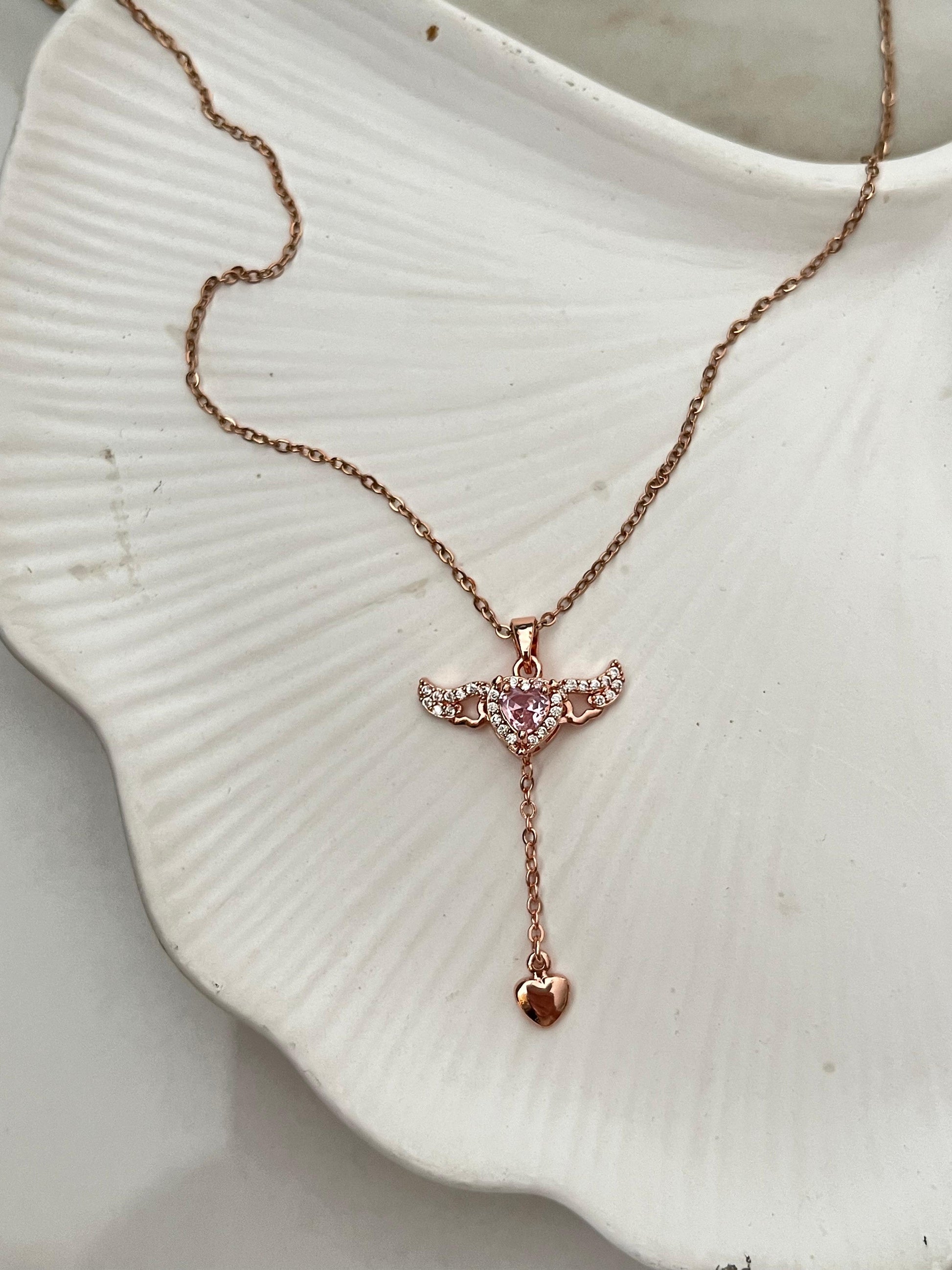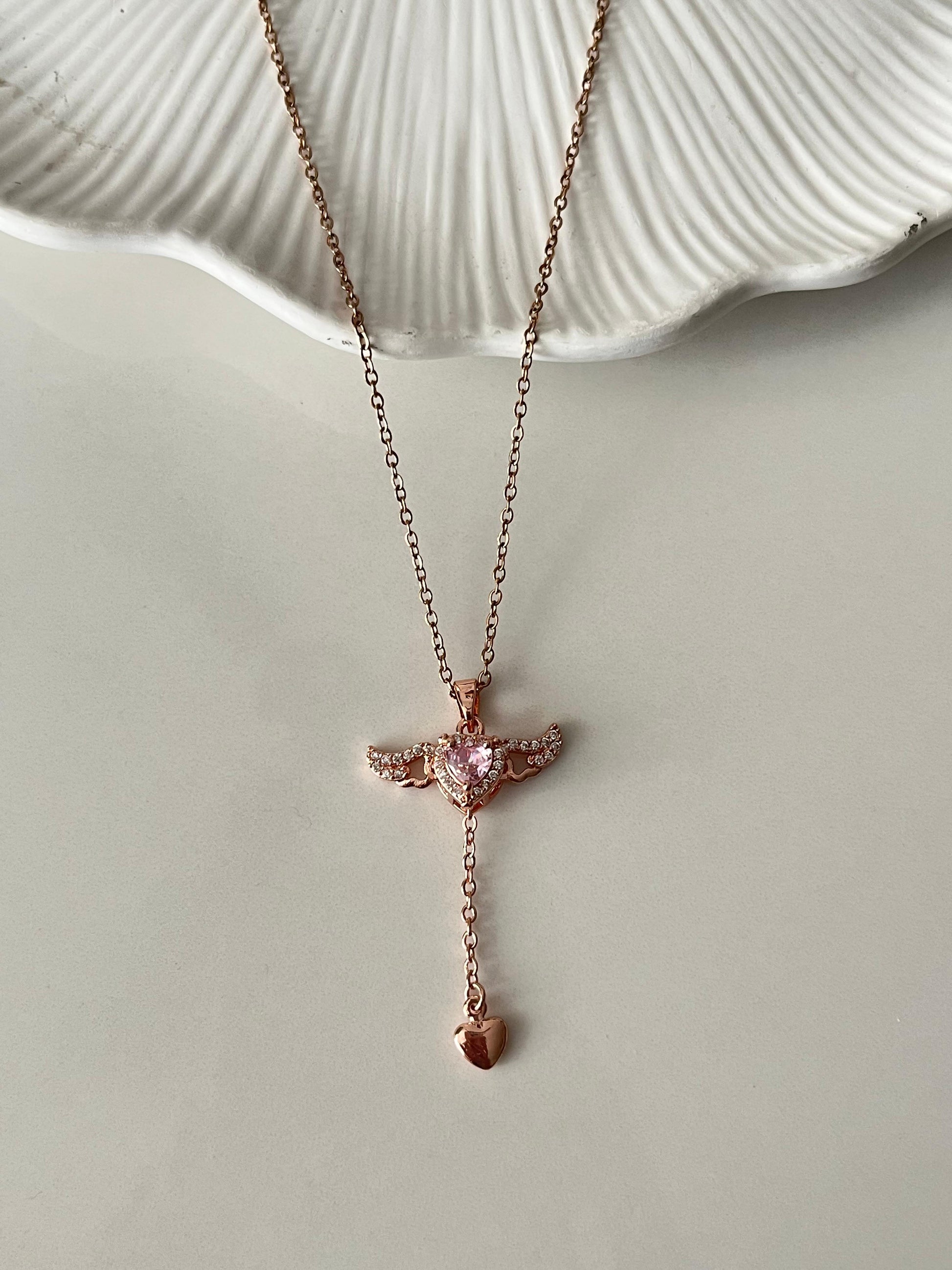 This enchanting winged heart necklace captures the essence of romance with its graceful design and soft blush tones. Crafted from premium stainless steel with a warm rose gold finish, it is anti-tarnish, waterproof, and hypoallergenic, ensuring beauty that lasts. The centerpiece features a delicate pink heart-shaped crystal framed by sparkling wings, symbolizing freedom, love, and protection. A dainty chain drop ends with a tiny rose gold heart, adding movement and charm with every step.