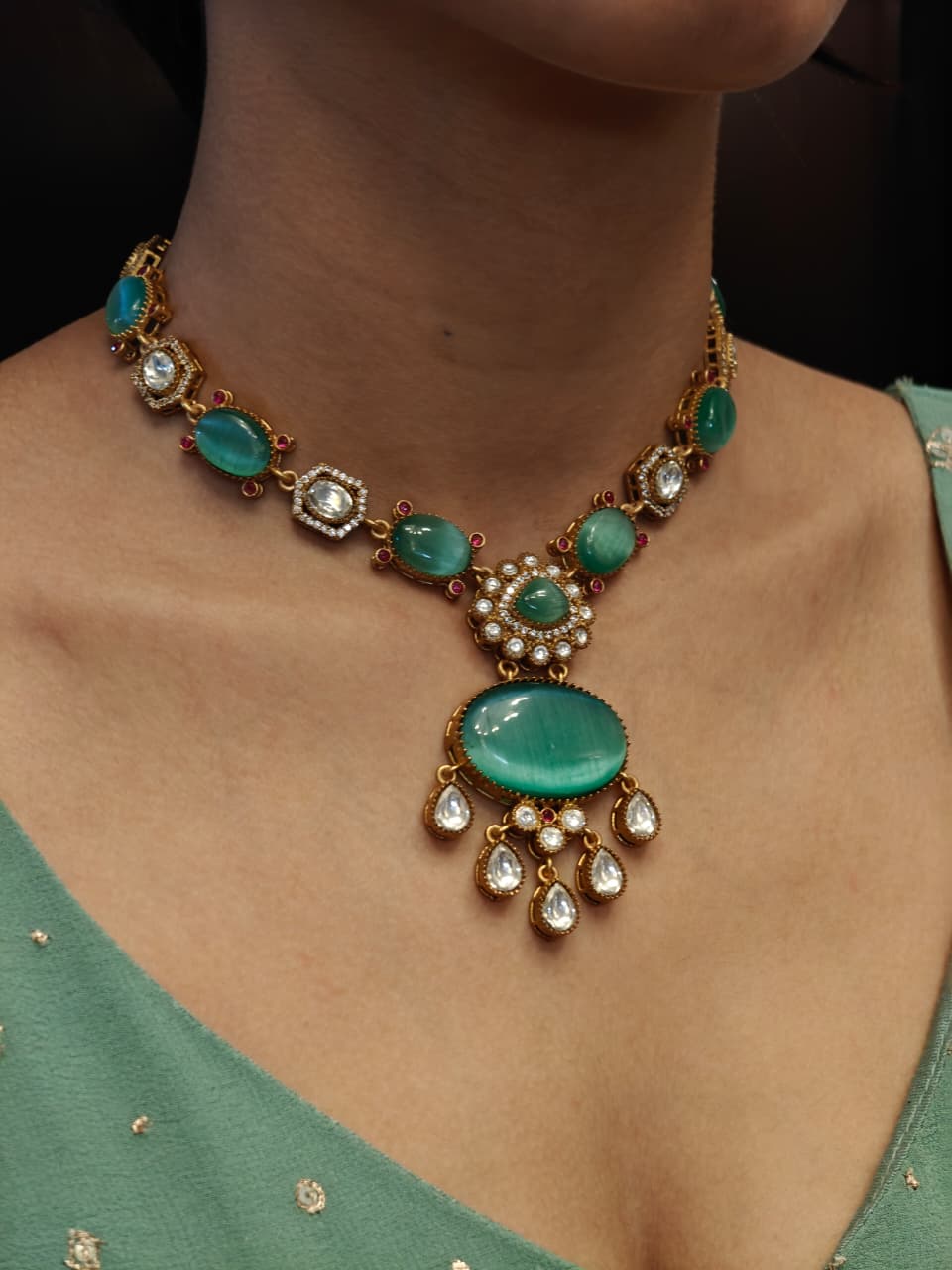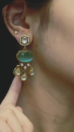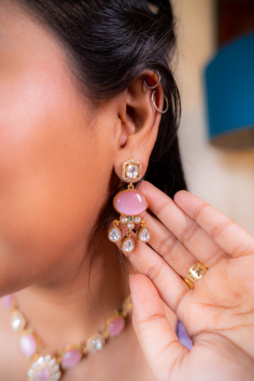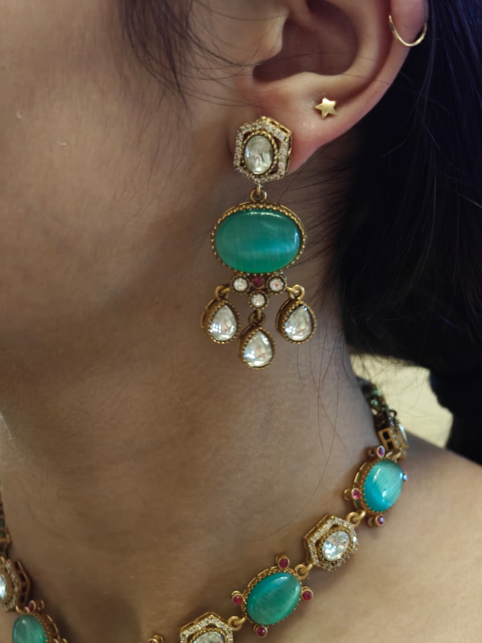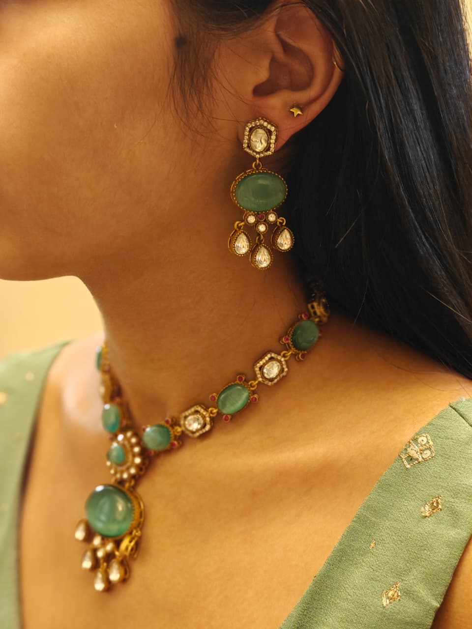 Gracefully crafted in premium brass, the Emerald Glow Heritage Set features captivating green gemstones paired with intricate Kundan-inspired detailing.A perfect pick for weddings, festive occasions, or elegant evenings, this statement set effortlessly blends tradition with timeless charm.