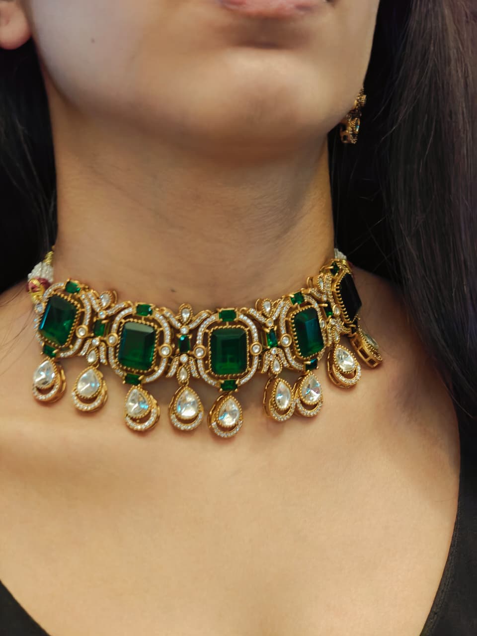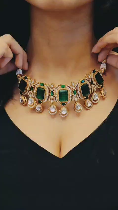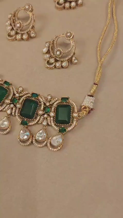 The set features deep emerald green stones surrounded by sparkling white crystals, all set in a rich gold-tone brass base. The intricate detailing and teardrop motifs exude timeless charm, making it perfect for weddings, festive occasions, or special celebrations.